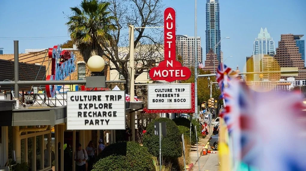 Street view of Austin Motel with city skyline in the background, showing a sign for a culture trip event, and string of patriotic decorations along the sidewalk.