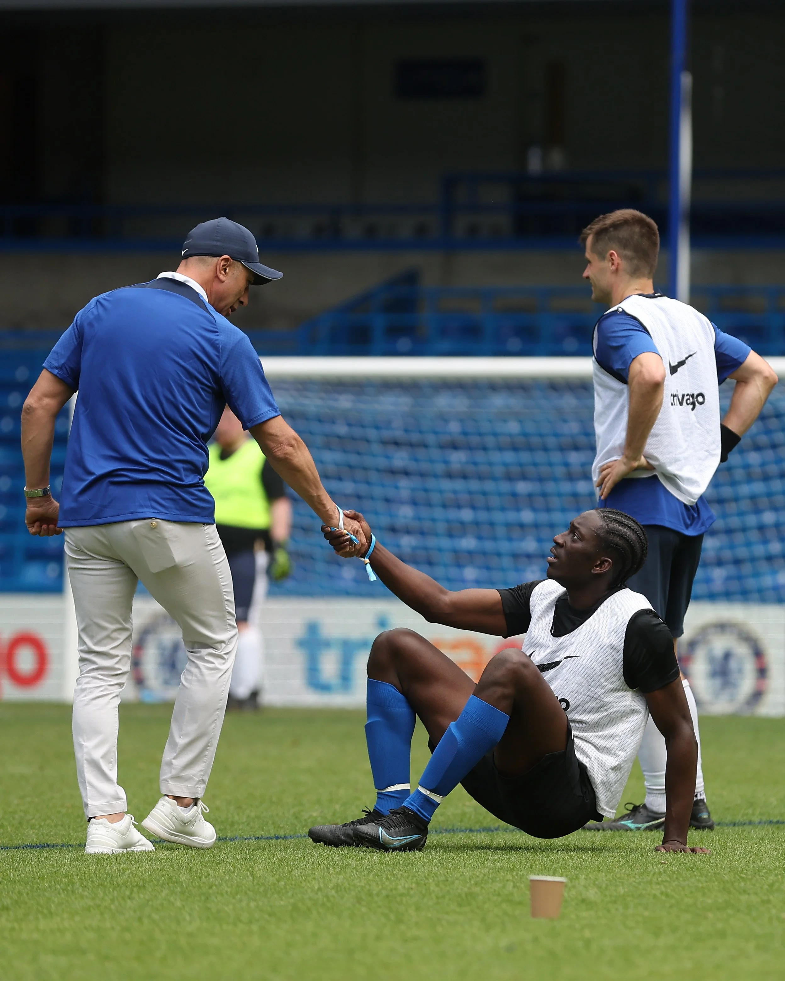 A soccer player sitting on the field shaking hands with a coach, with two other players standing nearby.