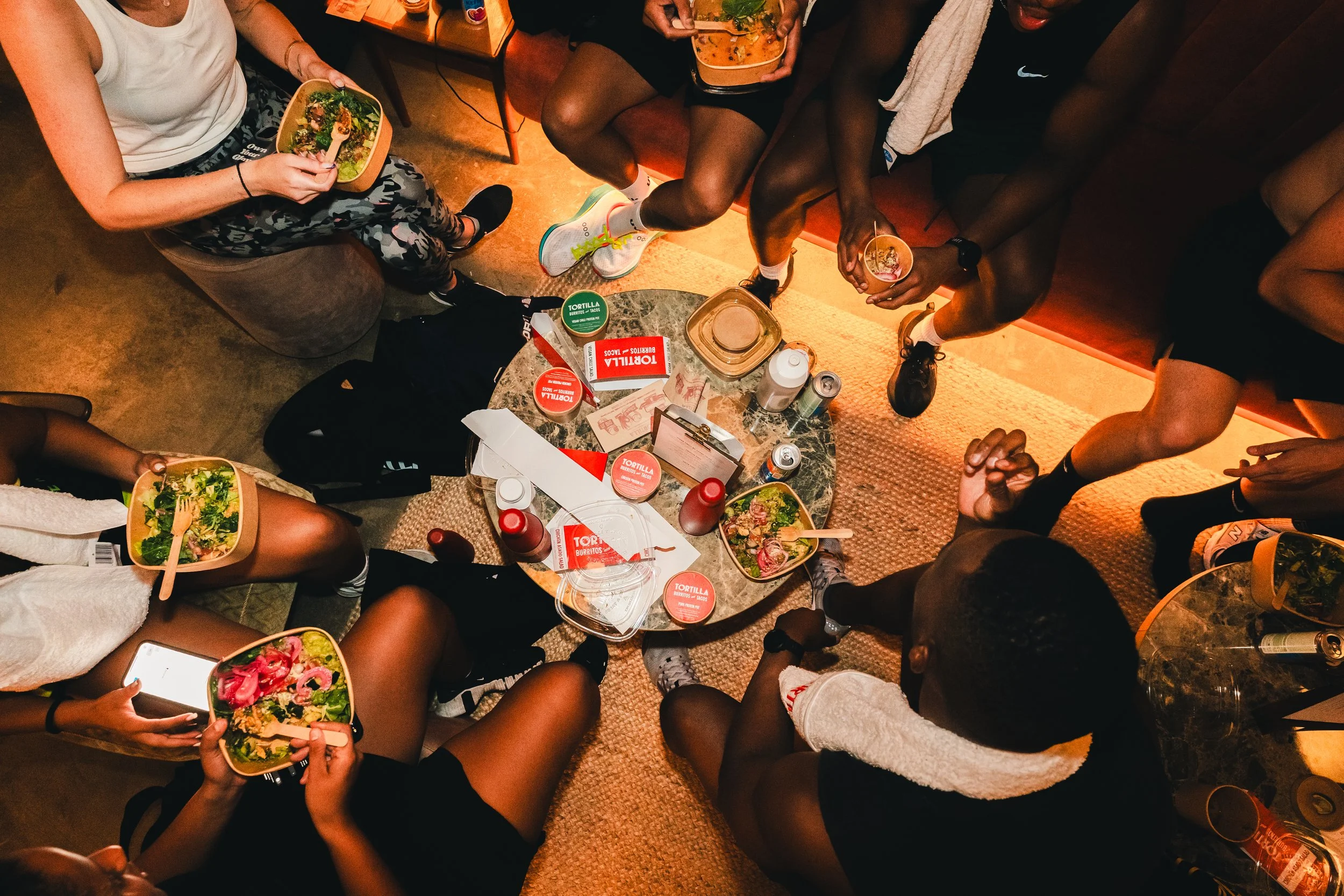 A group of people sitting around a small table with taco containers, drinks, and condiments, having a meal together.